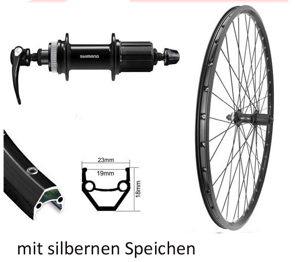 BW 28'' H-Rad 19-622 Exal DC19 schwarz Disk mit Ösen 36Loch, Shimano QC 400 Disk Centerlock 8-11fach Kassette Schnellspann schwarz, Speichen Niro silber