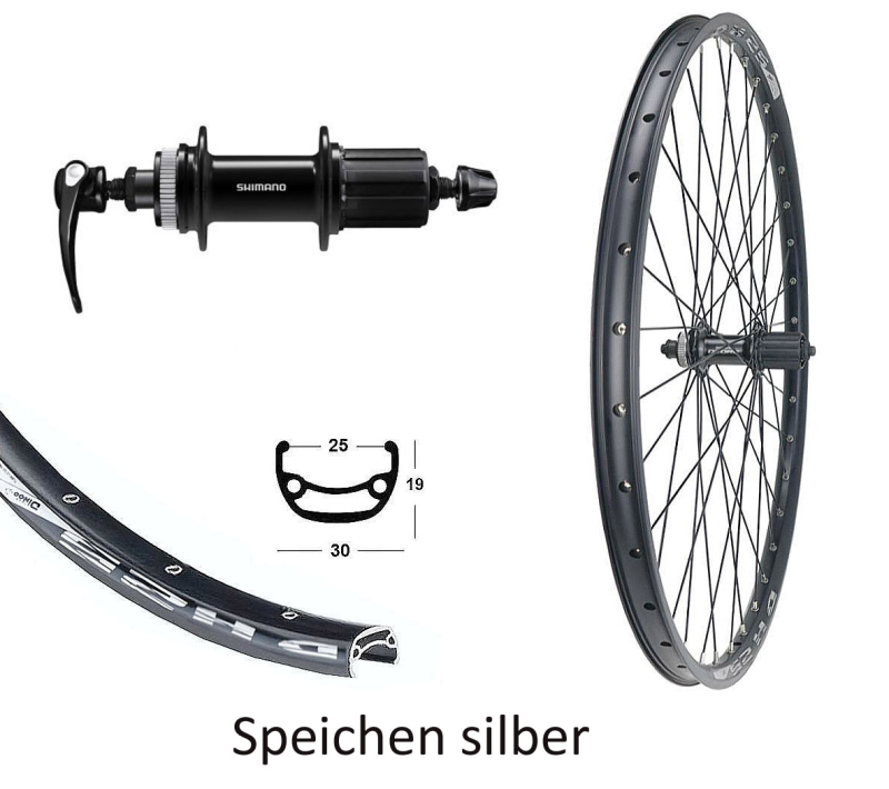 BW 28'' H-Rad 25-622 BDCP DH25 schwarz Disk mit Ösen 36Loch, Shimano QC300 Disk Centerlock 8-11fach Kassette Schnellspann schwarz, Speichen Niro silber