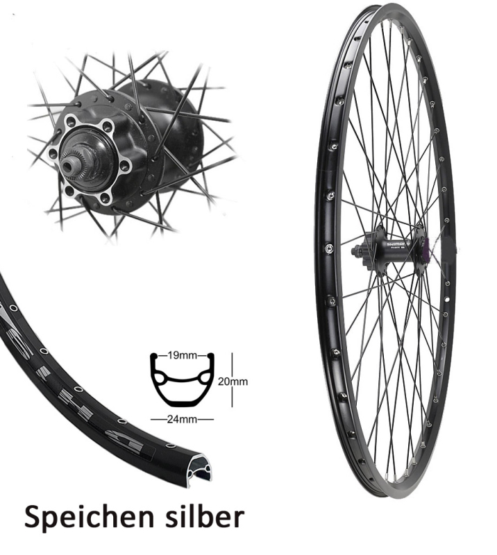 BW 28'' V-Rad 21-622 BDCP DH21 schwarz Disk mit Ösen 36Loch, Shimano M525 Disk 6-Loch Schnellspann schwarz, Speichen Niro silber