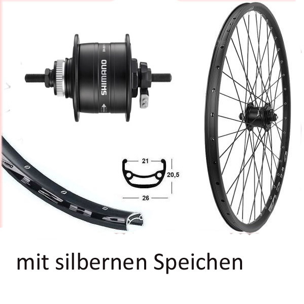BW 28'' V-Rad 21-622 BDCP DH21 schwarz Disk mit Ösen 36Loch, Shimano Nabendynamo DH3D37 Disk Centerlock Mutternausführung schwarz, Speichen Niro silber