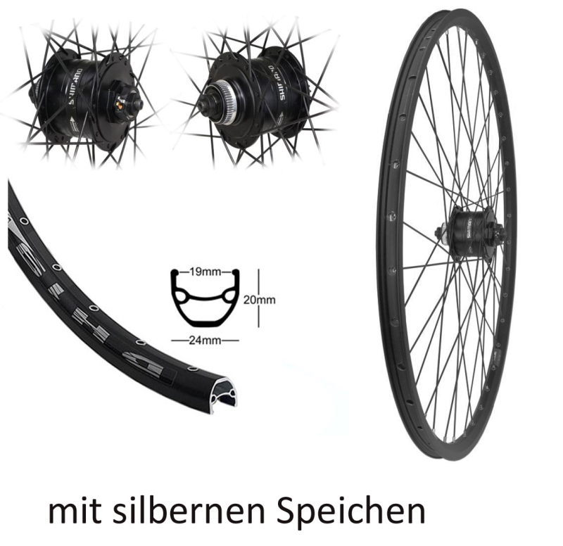 BW 28'' V-Rad 21-622 BDCP DH21 schwarz Disk mit Ösen 36Loch, Shimano Nabendynamo DH3D37 Disk Centerlock Schnellspann schwarz, Speichen Niro silber