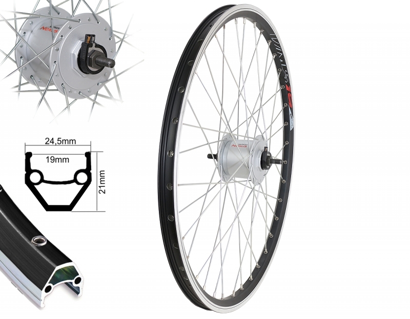 Bärwinkels 24'' V-Rad Black Dingo DMS19 schwarz mit Ösen 36Loch, Shimano Nabendynamo DH-C30003 Vollachse silber, Speichen 2mm glanzverzinkt silber