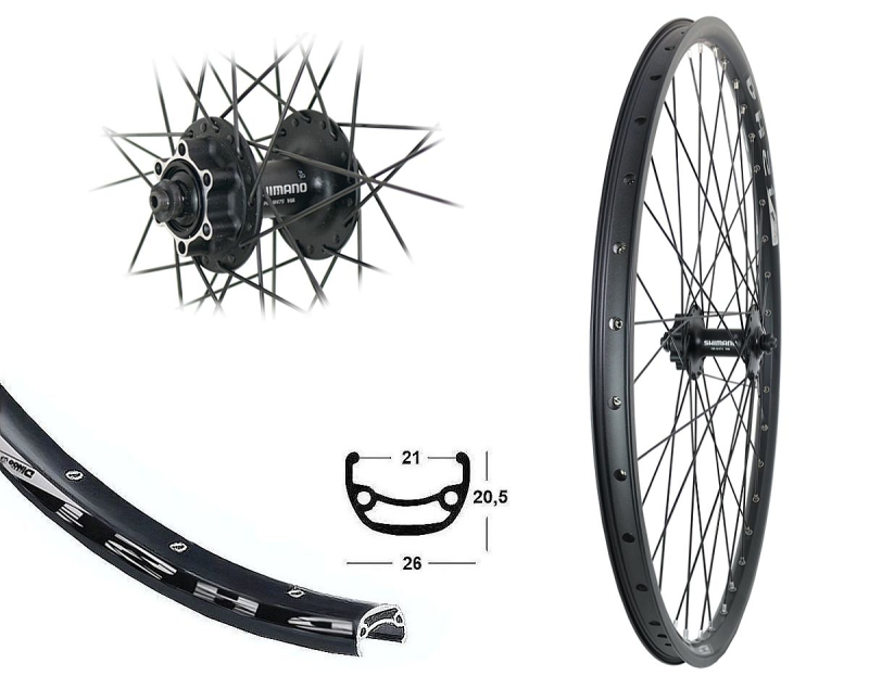 BW 26" V-Rad 21-559 BDCP DH21 schwarz Disk mit Ösen 36Loch, Shimano M525 Disk 6-Loch Schnellspann schwarz, Speichen schwarz