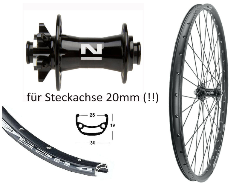 BW 27,5'' V-Rad 25-584 BDCP DH25 schwarz Disk mit Ösen 32Loch, Novatec DH61SB-HL Disk 6Loch EBB 110mm für Steckachse 20mm (!!) schwarz, Speichen Niro schwarz